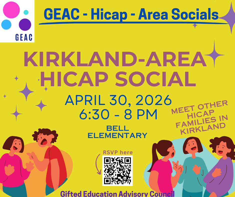 After a very successful series opener in Sammamish, we have our next upcoming event for our Kirkland families . Join us on April 30 for a family friendly get together at Bell Elementary to find and strengthen connections with other HiCap families in your area.